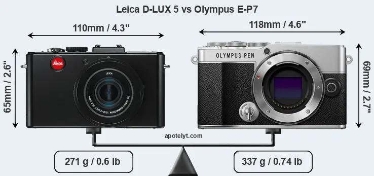 The above size and weight comparisons are to some extent incomplete and possibly misleading, as the D-LUX 5 has a lens built in, whereas the E-P7 is an interchangeable lens camera that requires a separate lens. Attaching the latter will add extra weight and bulk to the setup. You can compare the optics available for the E-P7 and their specifications in the Micro Four Thirds Lens Catalog.