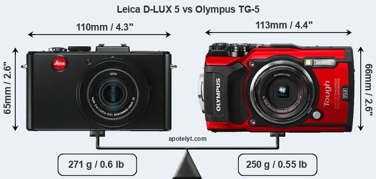 If the front view area (width x height) of the cameras is taken as an aggregate measure of their size, the Olympus TG-5 is somewhat larger (4 percent) than the Leica D-LUX 5. However, the TG-5 is markedly lighter (8 percent) than the D-LUX 5. It is noteworthy in this context that the TG-5 is splash and dust-proof, while the D-LUX 5 does not feature any corresponding weather-sealing. More than that, the TG-5 is water-proof up to 15m and can, thus, be used for underwater photography.