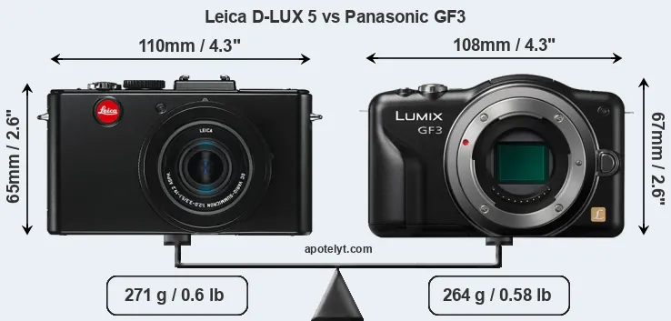 The above size and weight comparisons are to some extent incomplete and possibly misleading, as the D-LUX 5 has a lens built in, whereas the GF3 is an interchangeable lens camera that requires a separate lens. Attaching the latter will add extra weight and bulk to the setup. You can compare the optics available for the GF3 and their specifications in the Micro Four Thirds Lens Catalog.