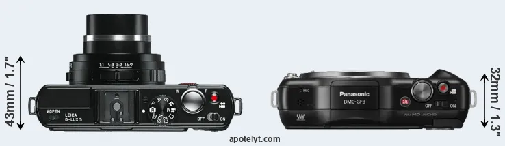 The Leica D-LUX 5 and the Panasonic Lumix DMC-GF3 are two digital cameras that were revealed to the public, respectively, in September 2010 and June 2011. The D-LUX 5 is a fixed lens compact, while the GF3 is a mirrorless interchangeable lens camera. The cameras are based on a 1/1.7-inch (D-LUX 5) and a Four Thirds (GF3) sensor. The Leica has a resolution of 10 megapixels, whereas the Panasonic provides 12 MP.