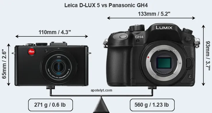 The above size and weight comparisons are to some extent incomplete and possibly misleading, as the D-LUX 5 has a lens built in, whereas the GH4 is an interchangeable lens camera that requires a separate lens. Attaching the latter will add extra weight and bulk to the setup. You can compare the optics available for the GH4 and their specifications in the Micro Four Thirds Lens Catalog.