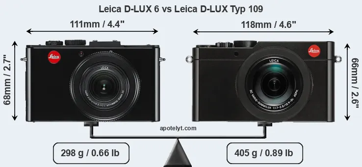 If the front view area (width x height) of the cameras is taken as an aggregate measure of their size, the Leica D-LUX Typ 109 is somewhat larger (3 percent) than the Leica D-LUX 6. Moreover, the D-LUX Typ 109 is substantially heavier (36 percent) than the D-LUX 6. In this context, it is worth noting that neither the D-LUX 6 nor the D-LUX Typ 109 are weather-sealed.
