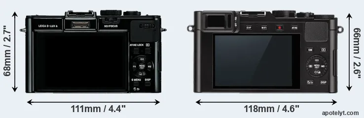 The side-by-side display below illustrates the physical size and weight of the Leica D-LUX 6 and the Leica D-LUX Typ 109. The two cameras are presented according to their relative size. Three successive views from the front, the top, and the rear are shown. All width, height and depth dimensions are rounded to the nearest millimeter.