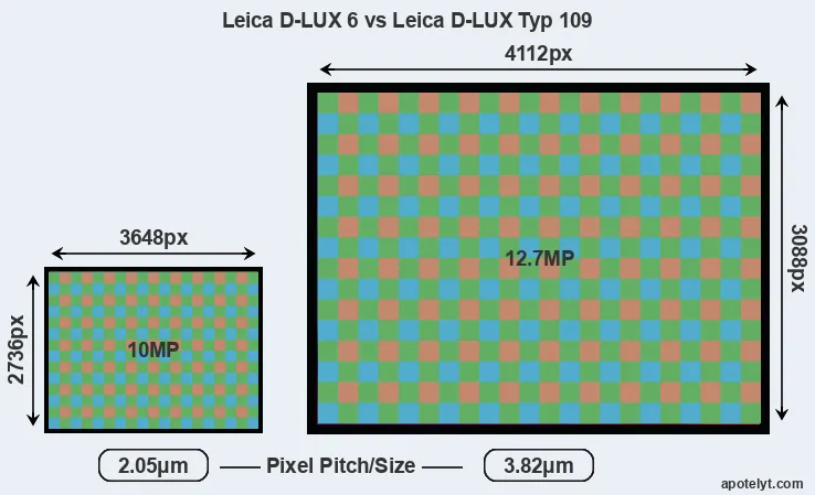 With 12.7MP, the D-LUX Typ 109 offers a higher resolution than the D-LUX 6 (10MP), but the D-LUX Typ 109 nevertheless has larger individual pixels (pixel pitch of 3.82μm versus 2.05μm for the D-LUX 6) due to its larger sensor. Moreover, the D-LUX Typ 109 is a somewhat more recent model (by 1 year and 11 months) than the D-LUX 6, and its sensor might have benefitted from technological advances during this time that further enhance the light gathering capacity of its pixel-units.