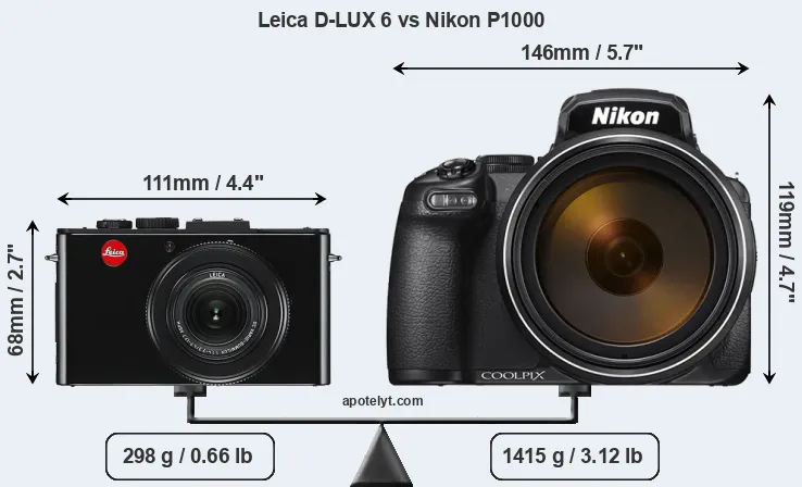 If the front view area (width x height) of the cameras is taken as an aggregate measure of their size, the Nikon P1000 is considerably larger (130 percent) than the Leica D-LUX 6. Moreover, the P1000 is substantially heavier (375 percent) than the D-LUX 6. In this context, it is worth noting that neither the D-LUX 6 nor the P1000 are weather-sealed.
