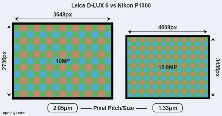 Despite having a smaller sensor, the P1000 offers a higher resolution of 15.9 megapixels, compared with 10 MP of the D-LUX 6. This megapixels advantage comes at the cost of a higher pixel density and a smaller size of the individual pixel (with a pixel pitch of 1.33μm versus 2.05μm for the D-LUX 6). However, it should be noted that the P1000 is much more recent (by 5 years and 9 months) than the D-LUX 6, and its sensor will have benefitted from technological advances during this time that make it possible to gather light more efficiently. Coming back to sensor resolution, it should be mentioned that the P1000 has no anti-alias filter installed, so that it can capture all the detail its sensor resolves.
