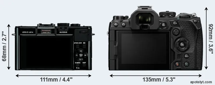 If the front view area (width x height) of the cameras is taken as an aggregate measure of their size, the OM System OM-1 is considerably larger (65 percent) than the Leica D-LUX 6. It is noteworthy in this context that the OM-1 is splash and dust-proof, while the D-LUX 6 does not feature any corresponding weather-sealing.