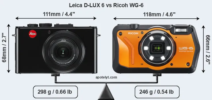 The side-by-side display below illustrates the physical size and weight of the Leica D-LUX 6 and the Ricoh WG-6. The two cameras are presented according to their relative size. Three consecutive perspectives from the front, the top, and the back are available. All width, height and depth dimensions are rounded to the nearest millimeter.