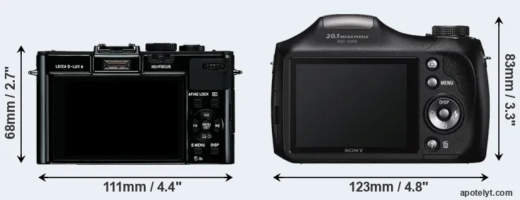 If the front view area (width x height) of the cameras is taken as an aggregate measure of their size, the Sony H200 is notably larger (35 percent) than the Leica D-LUX 6. Moreover, the H200 is substantially heavier (78 percent) than the D-LUX 6. In this context, it is worth noting that neither the D-LUX 6 nor the H200 are weather-sealed.