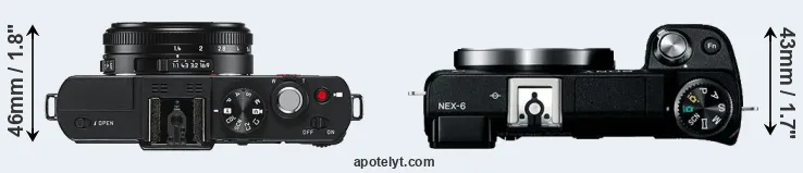 The side-by-side display below illustrates the physical size and weight of the Leica D-LUX 6 and the Sony NEX-6. The two cameras are presented according to their relative size. Three consecutive views from the front, the top, and the rear side are shown. All width, height and depth dimensions are rounded to the nearest millimeter.
