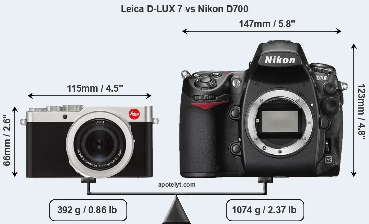 The above size and weight comparisons are to some extent incomplete and possibly misleading, as the D-LUX 7 has a lens built in, whereas the D700 is an interchangeable lens camera that requires a separate lens. Attaching the latter will add extra weight and bulk to the setup. You can compare the optics available for the D700 and their specifications in the Nikon Lens Catalog.