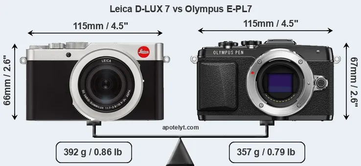 The physical size and weight of the Leica D-LUX 7 and the Olympus E-PL7 are illustrated in the side-by-side display below. The two cameras are presented according to their relative size. Three successive views from the front, the top, and the rear are shown. All size dimensions are rounded to the nearest millimeter.