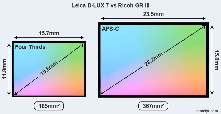 Of the two cameras under consideration, the Leica D-LUX 7 features a Four Thirds sensor and the Ricoh GR III an APS-C sensor. The sensor area in the GR III is 98 percent bigger. As a result of these sensor size differences, the cameras have a format factor of, respectively, 2.2 and 1.5. The sensor in the D-LUX 7 has a native 4:3 aspect ratio, while the one in the GR III offers a 3:2 aspect. The D-LUX 7 has the particularity of featuring a switch that allows to toggle between multiple aspect ratios, while maintaining the same field of view and full image resolution.