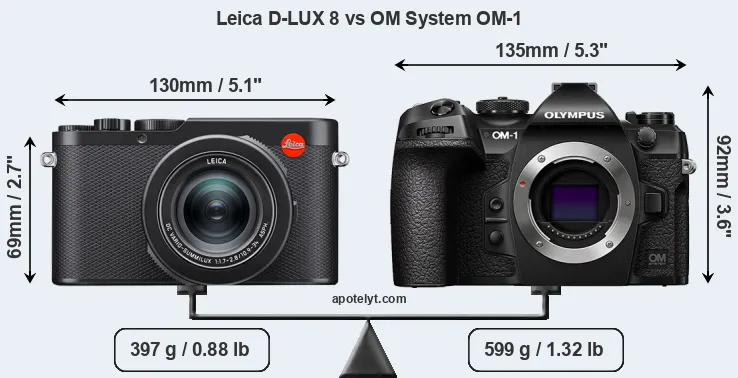 If the front view area (width x height) of the cameras is taken as an aggregate measure of their size, the OM System OM-1 is notably larger (38 percent) than the Leica D-LUX 8. It is noteworthy in this context that the OM-1 is splash and dust-proof, while the D-LUX 8 does not feature any corresponding weather-sealing.