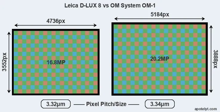 With 20.2MP, the OM-1 offers a higher resolution than the D-LUX 8 (16.8MP), but the OM-1 nevertheless has marginally larger individual pixels (pixel pitch of 3.34μm versus 3.32μm for the D-LUX 8) due to its larger sensor. However, the D-LUX 8 is a much more recent model (by 2 years and 4 months) than the OM-1, and its sensor will have benefitted from technological advances during this time that enhance the light gathering capacity of its pixel-units. Coming back to sensor resolution, it should be mentioned that neither of the two cameras has an anti-alias filter installed, so they are able to capture all the detail the sensor resolves.