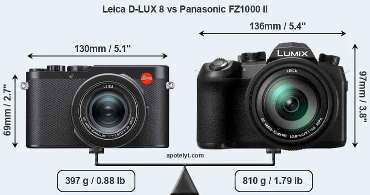 The side-by-side display below illustrates the physical size and weight of the Leica D-LUX 8 and the Panasonic FZ1000 II. The two cameras are presented according to their relative size. Three consecutive perspectives from the front, the top, and the back are available. All width, height and depth dimensions are rounded to the nearest millimeter.
