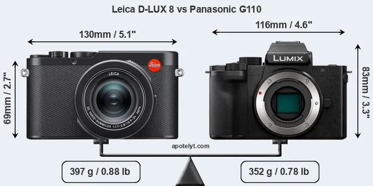 The above size and weight comparisons are to some extent incomplete and possibly misleading, as the D-LUX 8 has a lens built in, whereas the G110 is an interchangeable lens camera that requires a separate lens. Attaching the latter will add extra weight and bulk to the setup. You can compare the optics available for the G110 and their specifications in the Micro Four Thirds Lens Catalog.