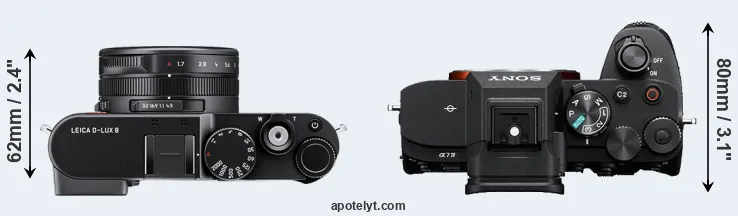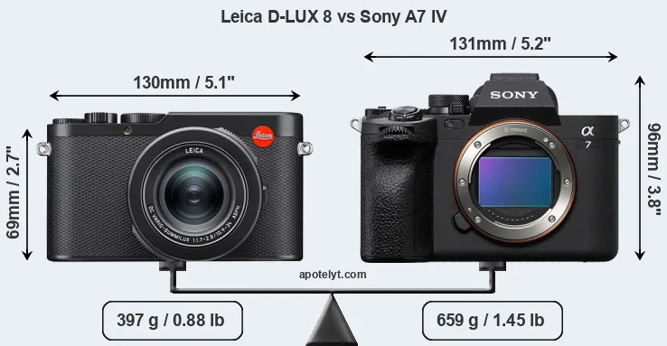 The above size and weight comparisons are to some extent incomplete and possibly misleading, as the D-LUX 8 has a lens built in, whereas the A7 IV is an interchangeable lens camera that requires a separate lens. Attaching the latter will add extra weight and bulk to the setup. You can compare the optics available for the A7 IV and their specifications in the Sony FE Lens Catalog.