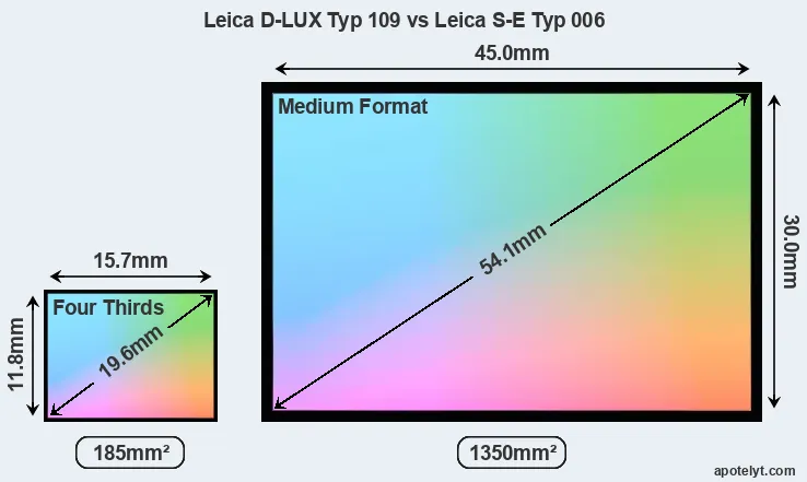 Of the two cameras under consideration, the Leica D-LUX Typ 109 features a Four Thirds sensor and the Leica S-E Typ 006 a medium format sensor. The sensor area in the S-E Typ 006 is 630 percent bigger. As a result of these sensor size differences, the cameras have a format factor of, respectively, 2.0 and 0.8. The sensor in the D-LUX Typ 109 has a native 4:3 aspect ratio, while the one in the S-E Typ 006 offers a 3:2 aspect. The D-LUX Typ 109 has the particularity of featuring a switch that allows to toggle between multiple aspect ratios, while maintaining the same field of view and full image resolution.