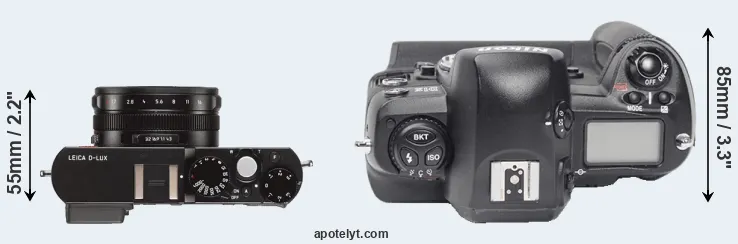 If the front view area (width x height) of the cameras is taken as an aggregate measure of their size, the Nikon D1X is considerably larger (208 percent) than the Leica D-LUX Typ 109. It is noteworthy in this context that the D1X is splash and dust-proof, while the D-LUX Typ 109 does not feature any corresponding weather-sealing.