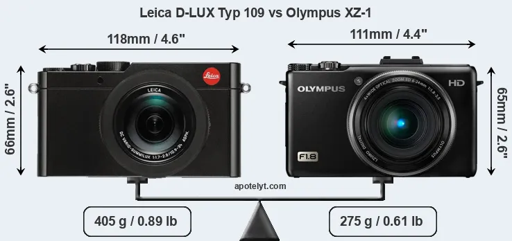 The physical size and weight of the Leica D-LUX Typ 109 and the Olympus XZ-1 are illustrated in the side-by-side display below. The two cameras are presented according to their relative size. Three consecutive perspectives from the front, the top, and the back are available. All width, height and depth dimensions are rounded to the nearest millimeter.