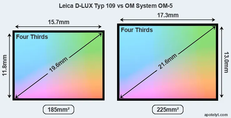 Both cameras under consideration feature a Four Thirds sensor, but their sensors differ slightly in size. The sensor area in the OM-5 is 22 percent bigger. They nevertheless have the same format factor of 2.0. Both cameras feature a native aspect ratio (sensor width to sensor height) of 4:3. The D-LUX Typ 109 has the particularity of featuring a switch that allows to toggle between multiple aspect ratios, while maintaining the same field of view and full image resolution.