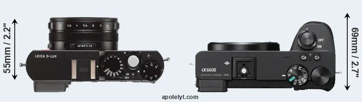 If the front view area (width x height) of the cameras is taken as an aggregate measure of their size, the Sony A6600 is somewhat larger (3 percent) than the Leica D-LUX Typ 109. It is noteworthy in this context that the A6600 is splash and dust-proof, while the D-LUX Typ 109 does not feature any corresponding weather-sealing.