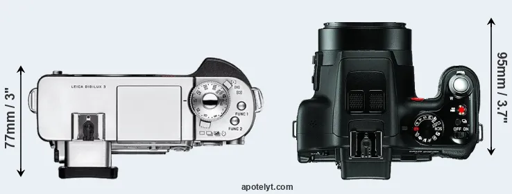 The side-by-side display below illustrates the physical size and weight of the Leica Digilux 3 and the Leica V-LUX 3. The two cameras are presented according to their relative size. Three consecutive perspectives from the front, the top, and the back are available. All width, height and depth measures are rounded to the nearest millimeter.