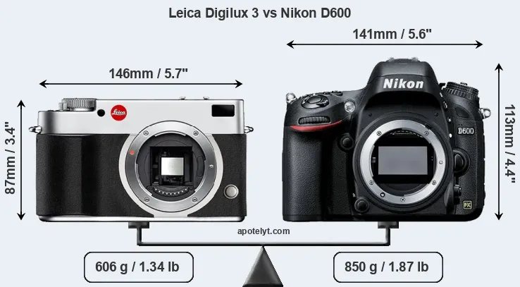 If the front view area (width x height) of the cameras is taken as an aggregate measure of their size, the Nikon D600 is notably larger (25 percent) than the Leica Digilux 3. Moreover, the D600 is substantially heavier (40 percent) than the Digilux 3. It is noteworthy in this context that the D600 is splash and dust-proof, while the Digilux 3 does not feature any corresponding weather-sealing.