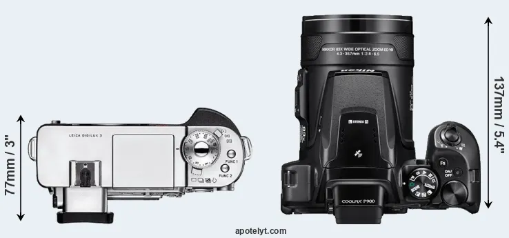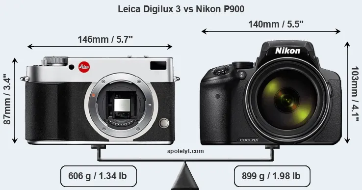 An illustration of the physical size and weight of the Leica Digilux 3 and the Nikon P900 is provided in the side-by-side display below. The two cameras are presented according to their relative size. Three consecutive views from the front, the top, and the rear side are shown. All width, height and depth dimensions are rounded to the nearest millimeter.