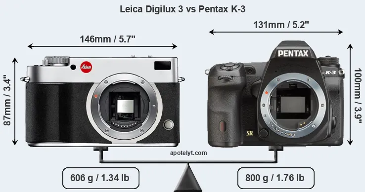 If the front view area (width x height) of the cameras is taken as an aggregate measure of their size, the Pentax K-3 is somewhat larger (3 percent) than the Leica Digilux 3. Moreover, the K-3 is markedly heavier (32 percent) than the Digilux 3. It is noteworthy in this context that the K-3 is splash and dust-proof, while the Digilux 3 does not feature any corresponding weather-sealing.