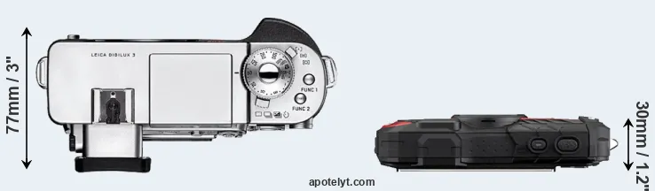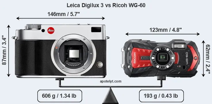 The side-by-side display below illustrates the physical size and weight of the Leica Digilux 3 and the Ricoh WG-60. The two cameras are presented according to their relative size. Three consecutive perspectives from the front, the top, and the back are available. All size dimensions are rounded to the nearest millimeter.