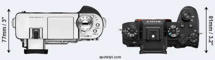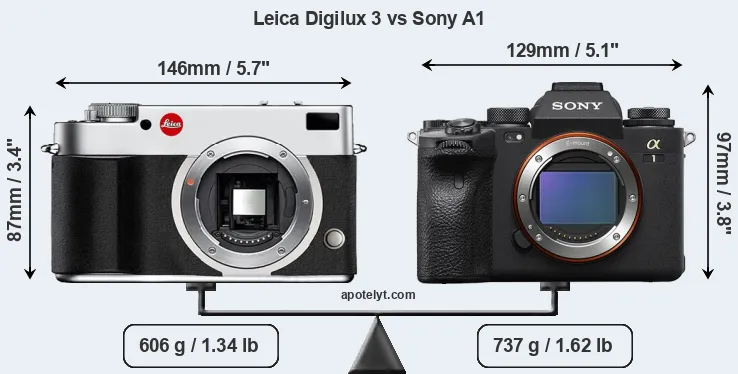 If the front view area (width x height) of the cameras is taken as an aggregate measure of their size, the Sony A1 is somewhat smaller (1 percent) than the Leica Digilux 3. However, the A1 is markedly heavier (22 percent) than the Digilux 3. It is noteworthy in this context that the A1 is splash and dust-proof, while the Digilux 3 does not feature any corresponding weather-sealing.