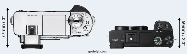 The side-by-side display below illustrates the physical size and weight of the Leica Digilux 3 and the Sony A6100. The two cameras are presented according to their relative size. Three consecutive views from the front, the top, and the rear side are shown. All size dimensions are rounded to the nearest millimeter.