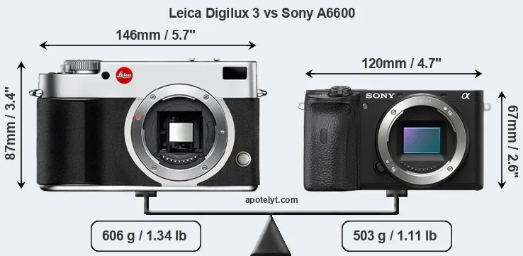 If the front view area (width x height) of the cameras is taken as an aggregate measure of their size, the Sony A6600 is considerably smaller (37 percent) than the Leica Digilux 3. Moreover, the A6600 is markedly lighter (17 percent) than the Digilux 3. It is noteworthy in this context that the A6600 is splash and dust-proof, while the Digilux 3 does not feature any corresponding weather-sealing.