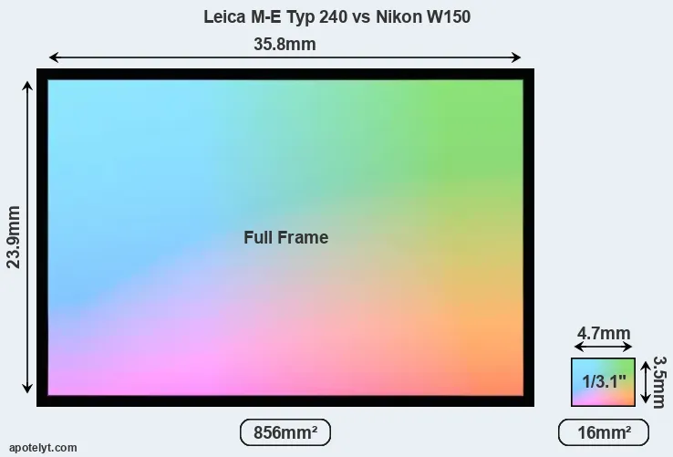 Of the two cameras under consideration, the Leica M-E Typ 240 features a full frame sensor and the Nikon W150 a 1/3.1-inch sensor. The sensor area in the W150 is 98 percent smaller. As a result of these sensor size differences, the cameras have a format factor of, respectively, 1.0 and 7.4. The sensor in the M-E Typ 240 has a native 3:2 aspect ratio, while the one in the W150 offers a 4:3 aspect.