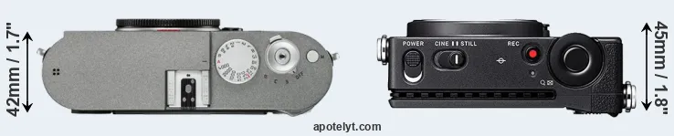 The side-by-side display below illustrates the physical size and weight of the Leica M-E Typ 240 and the Sigma fp. The two cameras are presented according to their relative size. Three successive views from the front, the top, and the rear are shown. All size dimensions are rounded to the nearest millimeter.