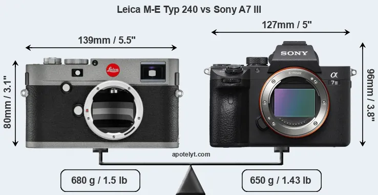 An illustration of the physical size and weight of the Leica M-E Typ 240 and the Sony A7 III is provided in the side-by-side display below. The two cameras are presented according to their relative size. Three successive views from the front, the top, and the rear are shown. All width, height and depth dimensions are rounded to the nearest millimeter.