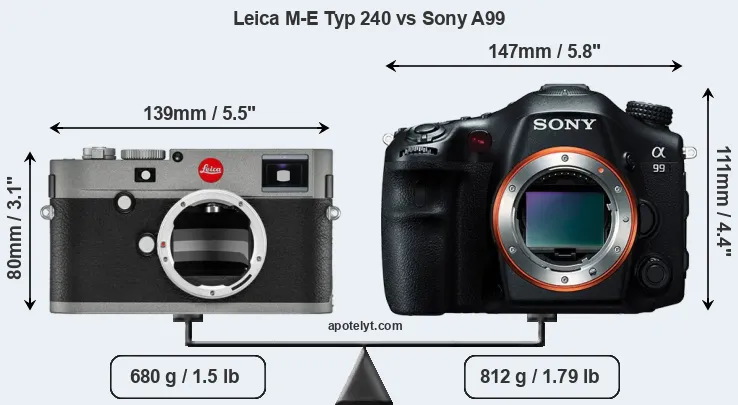 If the front view area (width x height) of the cameras is taken as an aggregate measure of their size, the Sony A99 is considerably larger (47 percent) than the Leica M-E Typ 240. Moreover, the A99 is markedly heavier (19 percent) than the M-E Typ 240. In this context, it is worth noting that both cameras are splash and dust-proof and can, hence, be used in inclement weather conditions or harsh environments.