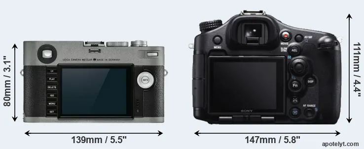 The side-by-side display below illustrates the physical size and weight of the Leica M-E Typ 240 and the Sony A99. The two cameras are presented according to their relative size. Three consecutive views from the front, the top, and the rear side are shown. All width, height and depth dimensions are rounded to the nearest millimeter.