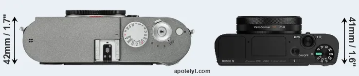 If the front view area (width x height) of the cameras is taken as an aggregate measure of their size, the Sony RX100 IV is considerably smaller (47 percent) than the Leica M-E Typ 240. It is worth mentioning in this context that the M-E Typ 240 is splash and dust resistant, while the RX100 IV does not feature any corresponding weather-sealing.