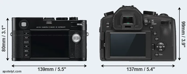 If the front view area (width x height) of the cameras is taken as an aggregate measure of their size, the Leica V-LUX Typ 114 is notably larger (22 percent) than the Leica M Typ 240. It is worth mentioning in this context that the M Typ 240 is splash and dust resistant, while the V-LUX Typ 114 does not feature any corresponding weather-sealing.