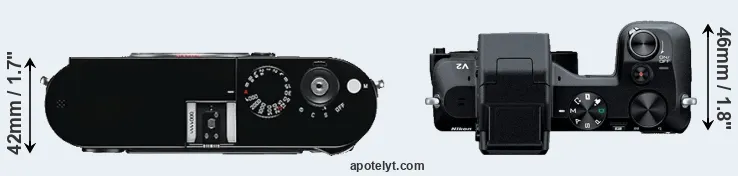 The physical size and weight of the Leica M Typ 240 and the Nikon 1 V2 are illustrated in the side-by-side display below. The two cameras are presented according to their relative size. Three consecutive perspectives from the front, the top, and the back are available. All width, height and depth dimensions are rounded to the nearest millimeter.