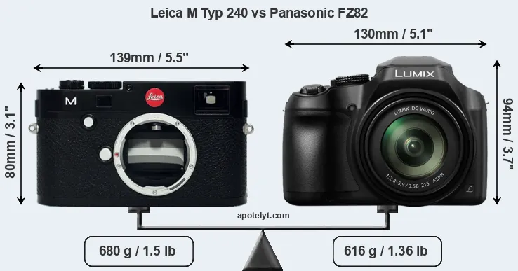 If the front view area (width x height) of the cameras is taken as an aggregate measure of their size, the Panasonic FZ82 is notably larger (10 percent) than the Leica M Typ 240. It is worth mentioning in this context that the M Typ 240 is splash and dust resistant, while the FZ82 does not feature any corresponding weather-sealing.