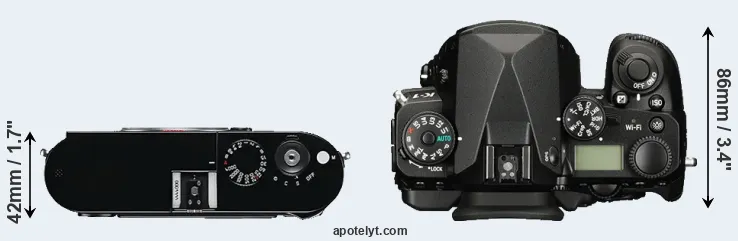 An illustration of the physical size and weight of the Leica M Typ 240 and the Pentax K-1 is provided in the side-by-side display below. The two cameras are presented according to their relative size. Three successive views from the front, the top, and the rear are shown. All width, height and depth dimensions are rounded to the nearest millimeter.