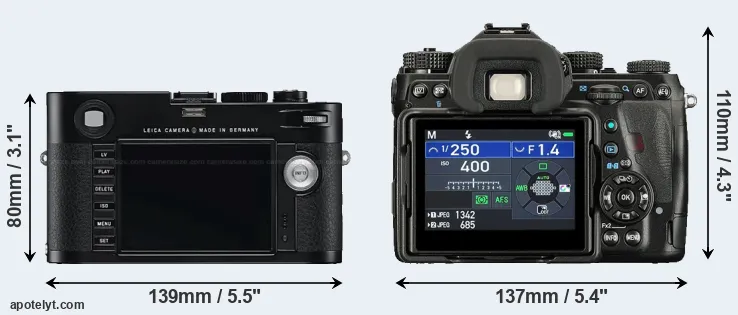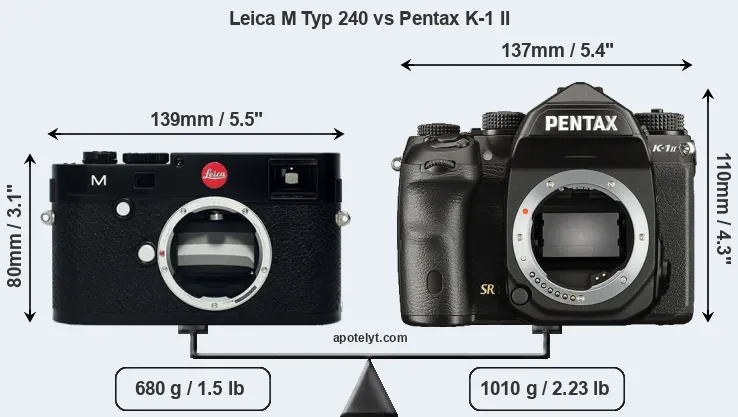 An illustration of the physical size and weight of the Leica M Typ 240 and the Pentax K-1 II is provided in the side-by-side display below. The two cameras are presented according to their relative size. Three successive views from the front, the top, and the rear are shown. All width, height and depth dimensions are rounded to the nearest millimeter.