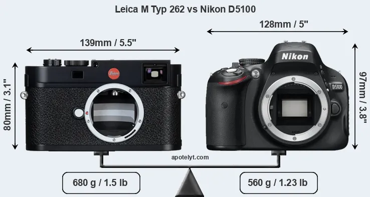 An illustration of the physical size and weight of the Leica M Typ 262 and the Nikon D5100 is provided in the side-by-side display below. The two cameras are presented according to their relative size. Three consecutive perspectives from the front, the top, and the back are available. All width, height and depth dimensions are rounded to the nearest millimeter.