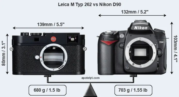 If the front view area (width x height) of the cameras is taken as an aggregate measure of their size, the Nikon D90 is notably larger (22 percent) than the Leica M Typ 262. Moreover, the D90 is slightly heavier (3 percent) than the M Typ 262. It is worth mentioning in this context that the M Typ 262 is splash and dust resistant, while the D90 does not feature any corresponding weather-sealing.