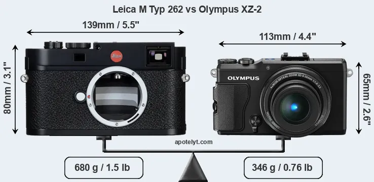 The physical size and weight of the Leica M Typ 262 and the Olympus XZ-2 are illustrated in the side-by-side display below. The two cameras are presented according to their relative size. Three successive views from the front, the top, and the rear are shown. All width, height and depth measures are rounded to the nearest millimeter.
