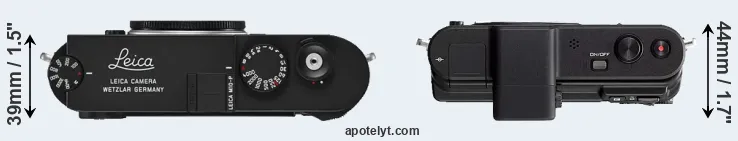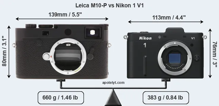 The physical size and weight of the Leica M10-P and the Nikon 1 V1 are illustrated in the side-by-side display below. The two cameras are presented according to their relative size. Three successive views from the front, the top, and the rear are shown. All width, height and depth dimensions are rounded to the nearest millimeter.